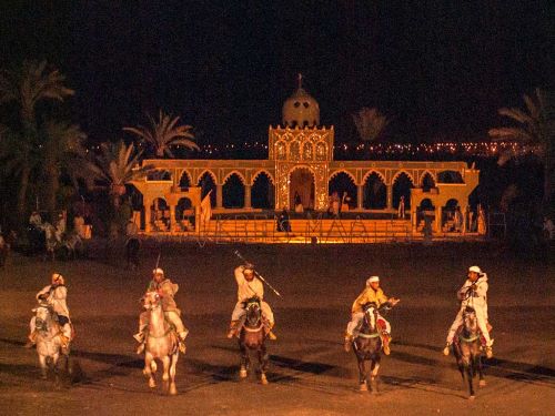 Experience a magical evening of Moroccan tradition at Chez Ali Fantasia in Marrakech. From your arrival through the torch-lit entrance...