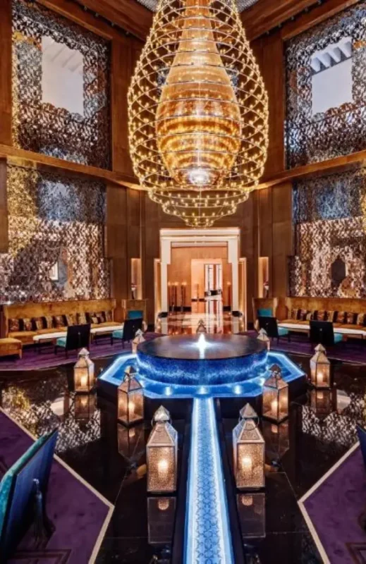 The lobby houses the estate’s treasure, its source, symbolized by a refined fountain topped by a monumental drop-shaped copper chandelier, beneath a magnificent dome.