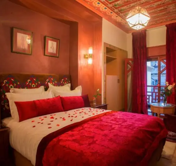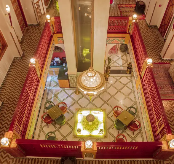 It took nine painstaking years of renovations to transform this former bank into a grand, fully functioning 18-room hotel. There’s no skimping on the elaborate craftsmanship emblematic of Morocco. From the filigree-style carved woodwork and intricately painted decorative panelling to the zellige tiling and oversized perforated brass chandeliers, this is a fine example of an updated traditional interior. Rooms are comfortably compact with contemporary Art Deco style beds, engraved Venetian mirrors and modern marble bathrooms, all facing onto a large inner courtyard where guests can have authentic Moroccan buffet breakfasts – spongy textured semolina beghrir pancakes, square msemen crepes, sweet olives, fresh goat’s cheese, nuts and dried fruit, washed down with heavyweight aromatic coffee. Akin to rocket fuel, this will help power you round the kasbah.